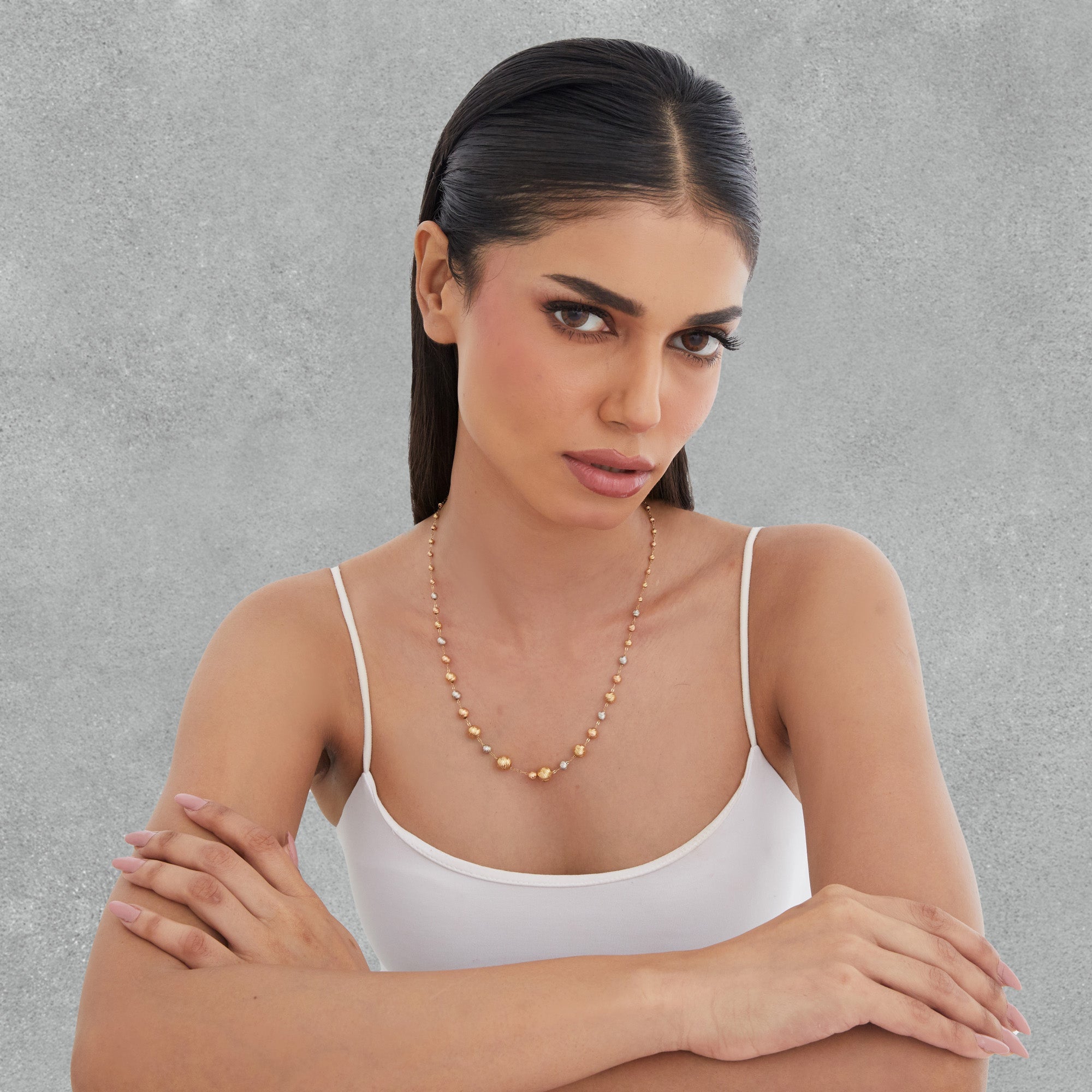 A soft, feminine tri-tone bead necklace that glows with textured shimmer, adding effortless elegance and graceful movement to every look.