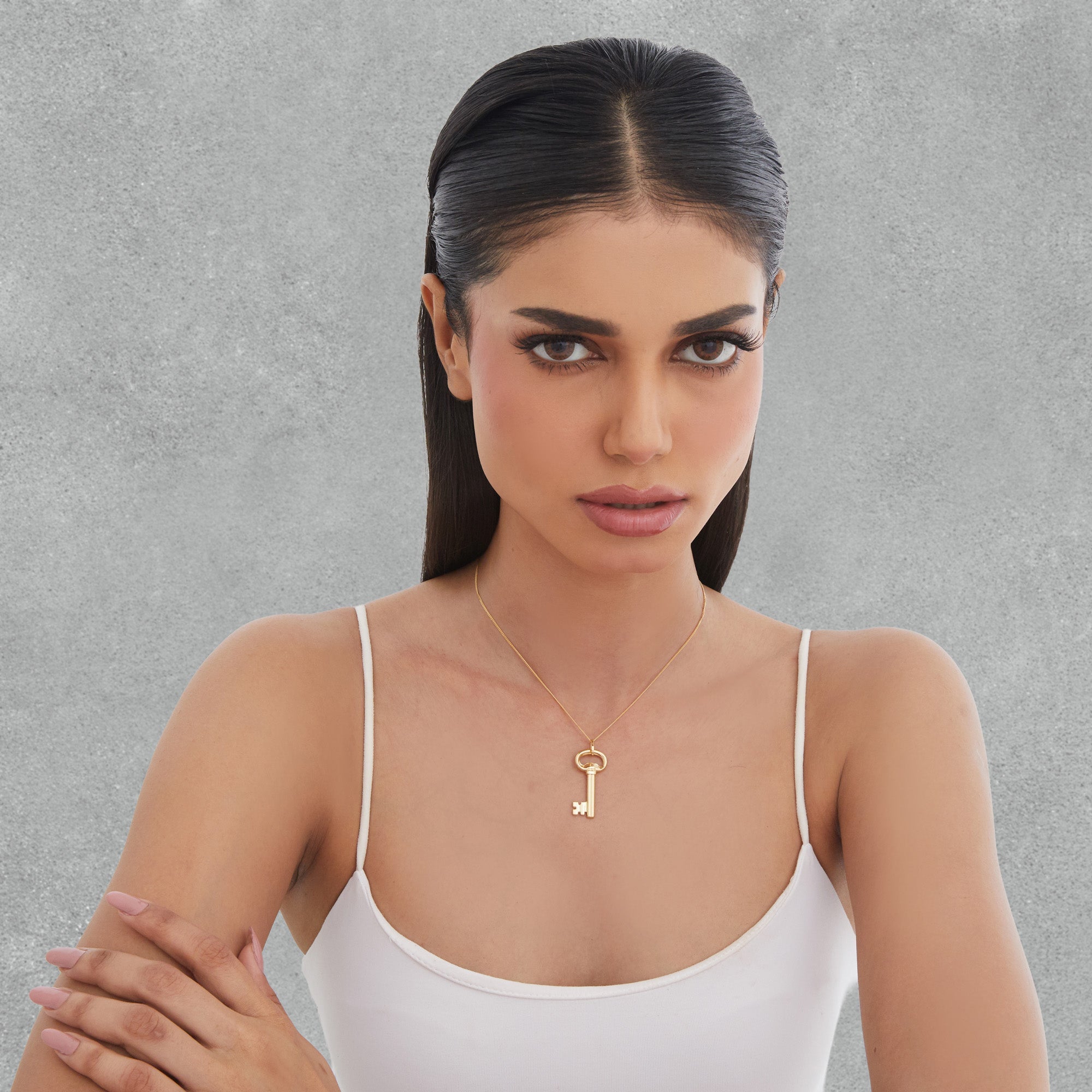 A polished 18k gold key symbolising opportunity and self-made destiny — crafted for women who unlock new paths with confidence, clarity, and quiet elegance.