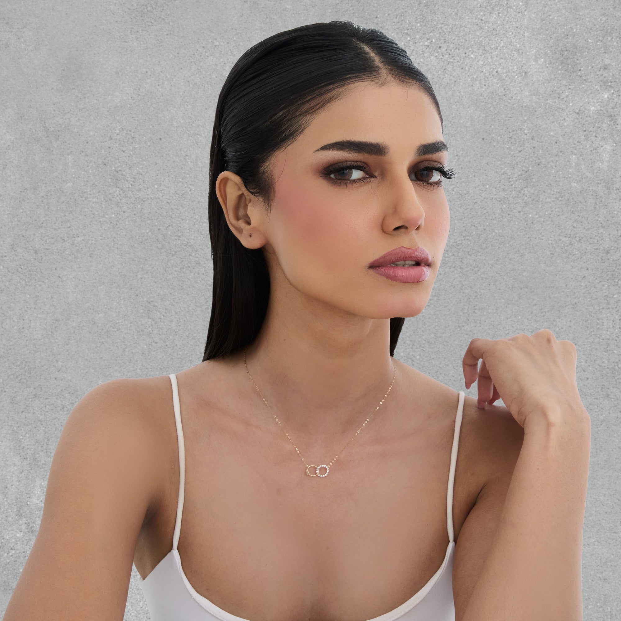 Two interlinked rings—one textured, one crowned with a sparkling stone—celebrate unity and feminine strength. A modern gold necklace perfect for effortless, everyday elegance.