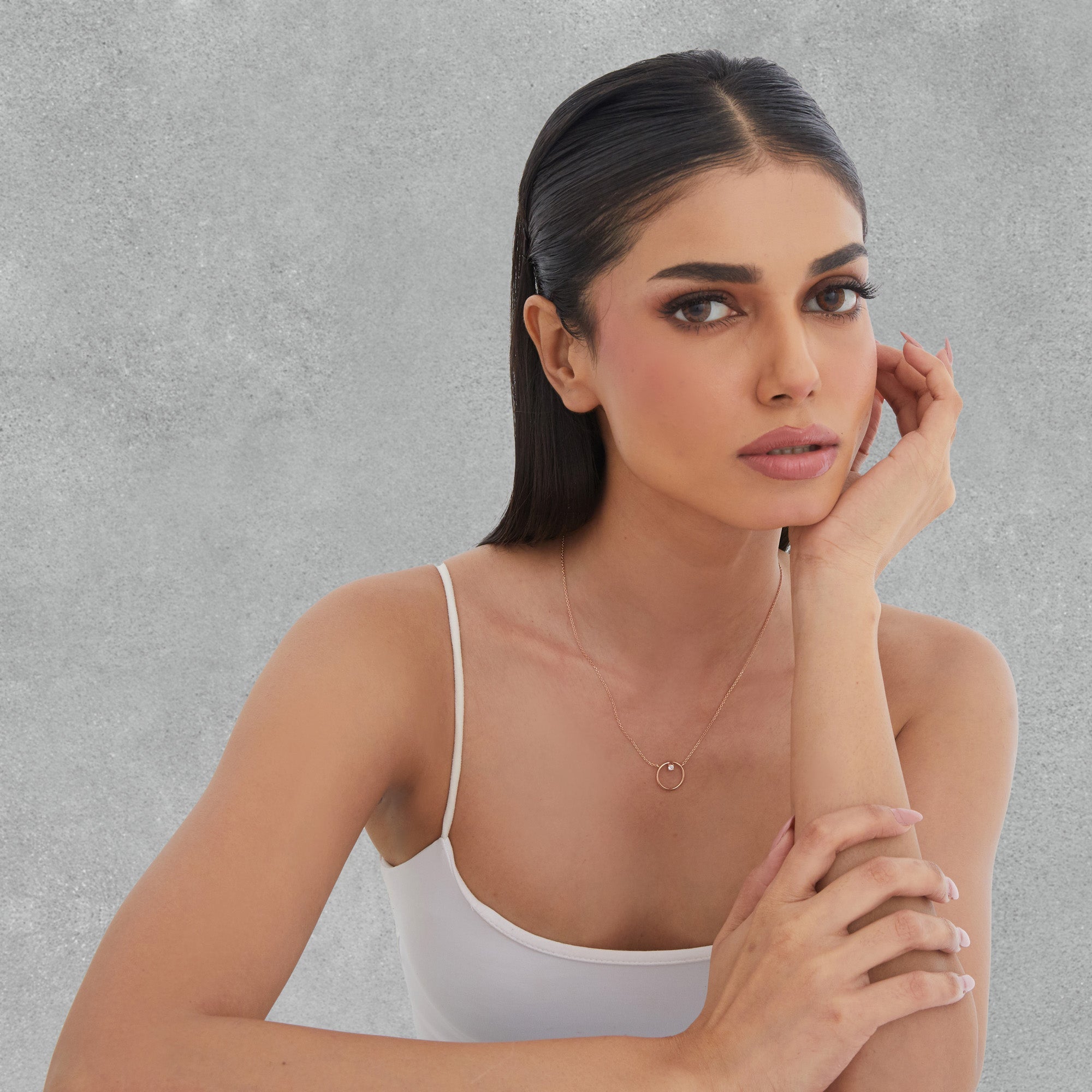 A sleek open-circle necklace crowned with a single sparkling stone, symbolising infinite elegance. Its minimal, modern design makes it perfect for effortless layering and everyday luxe style.