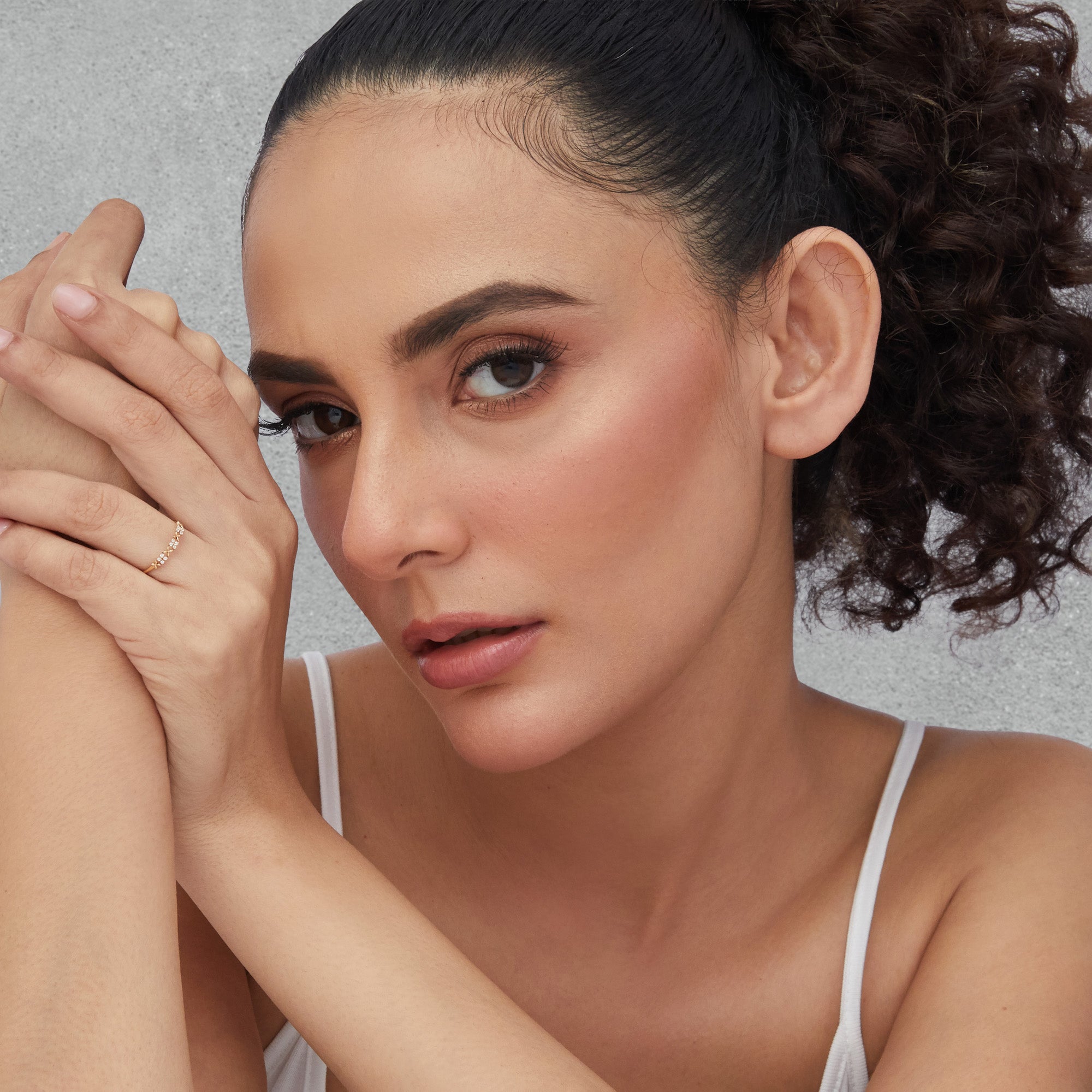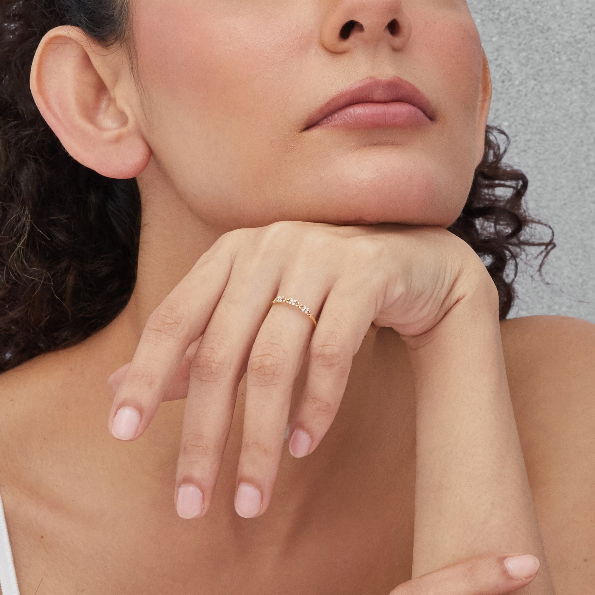 Delicate floral motifs accented with sparkling stones make this 18k gold ring a feminine, minimalist choice for women who love elegant everyday fine jewellery.
