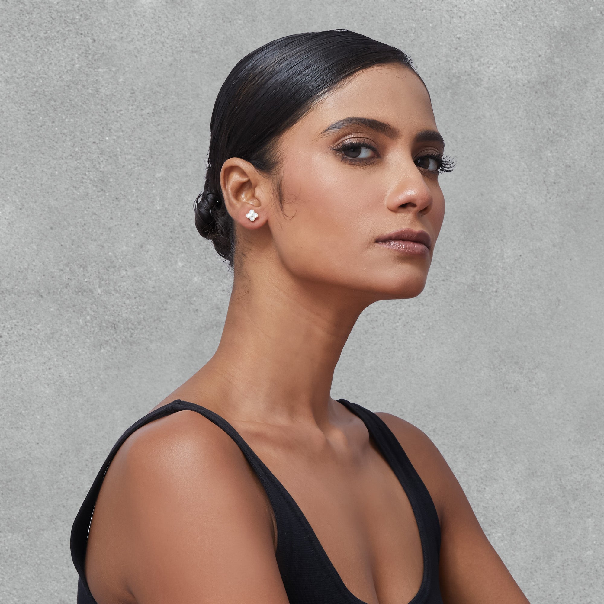 Translucent white petals with a sparkling center stone bring soft elegance to these 18k gold studs — perfect minimalist earrings for women who love delicate, everyday fine jewellery.