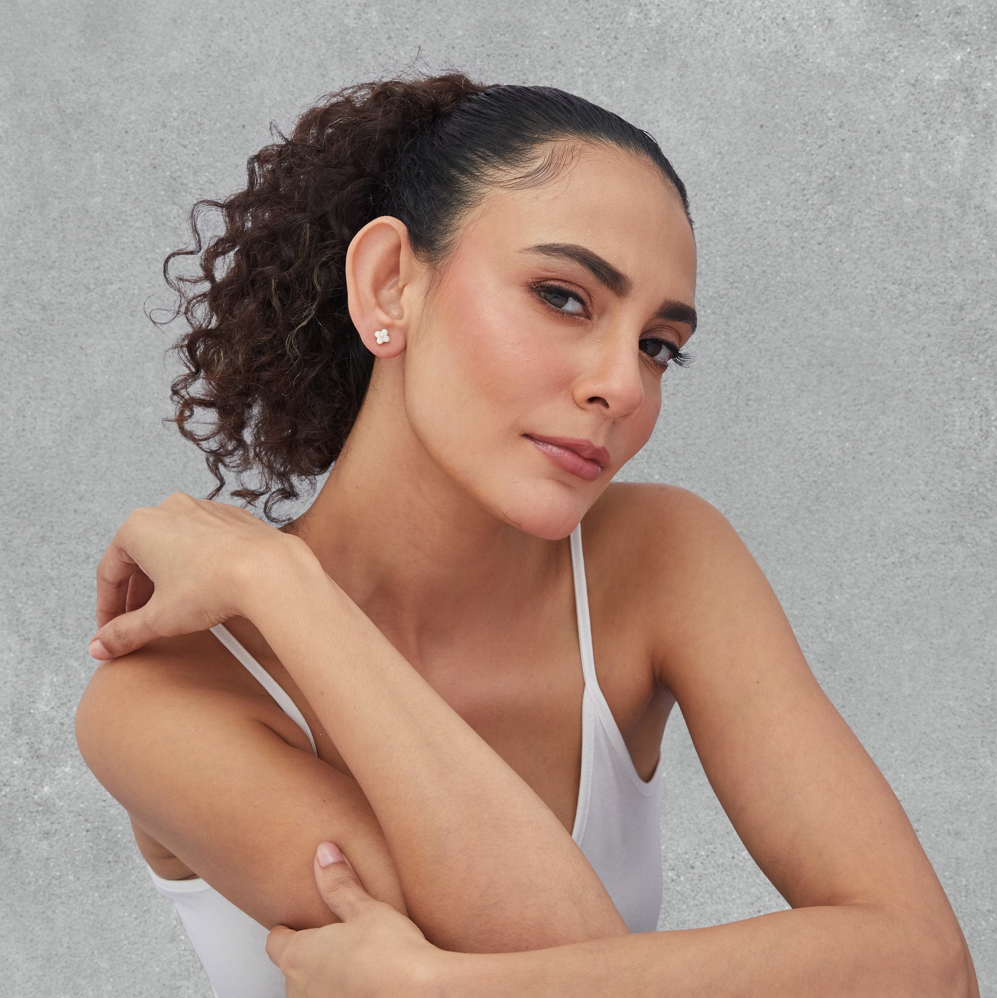 Translucent white petals with a sparkling center stone bring soft elegance to these 18k gold studs — perfect minimalist earrings for women who love delicate, everyday fine jewellery.
