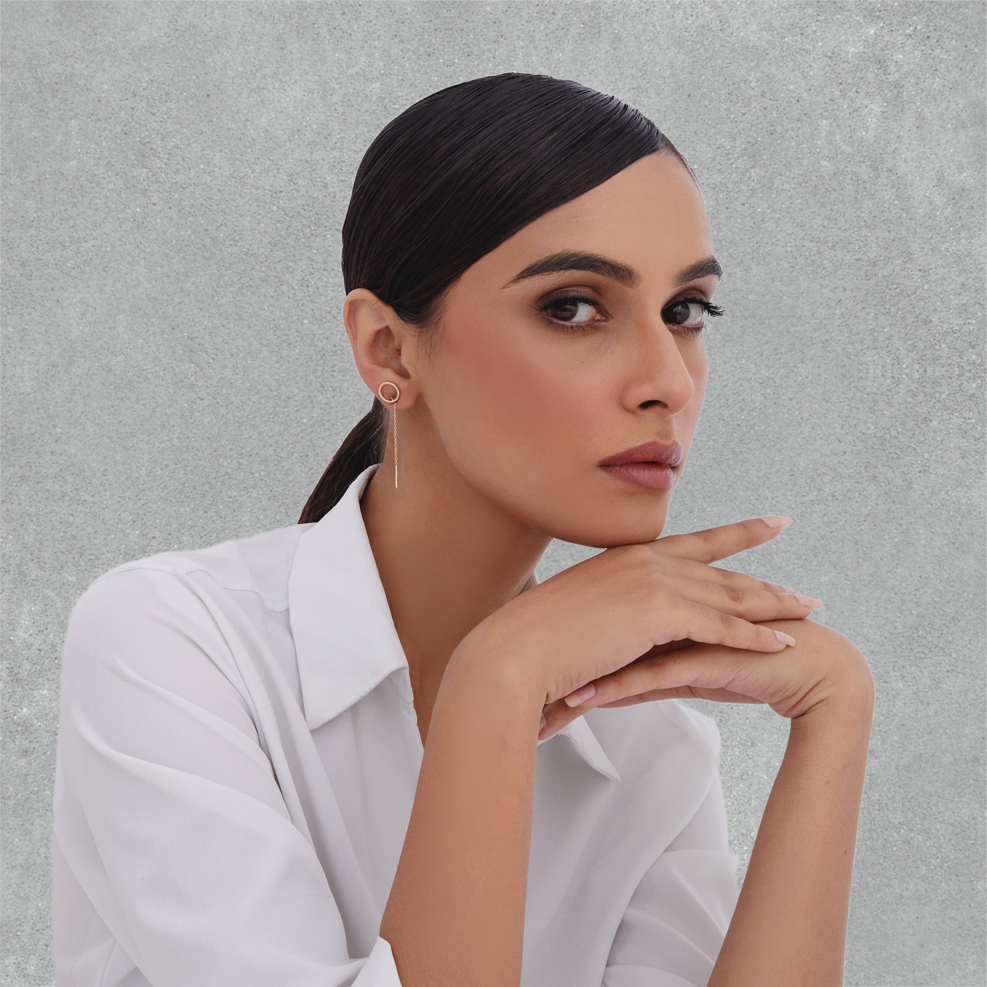 Sleek circle studs paired with fine gold chains create a modern, minimalist drop design — perfect 18k gold earrings for women who love elegant, lightweight everyday jewellery.