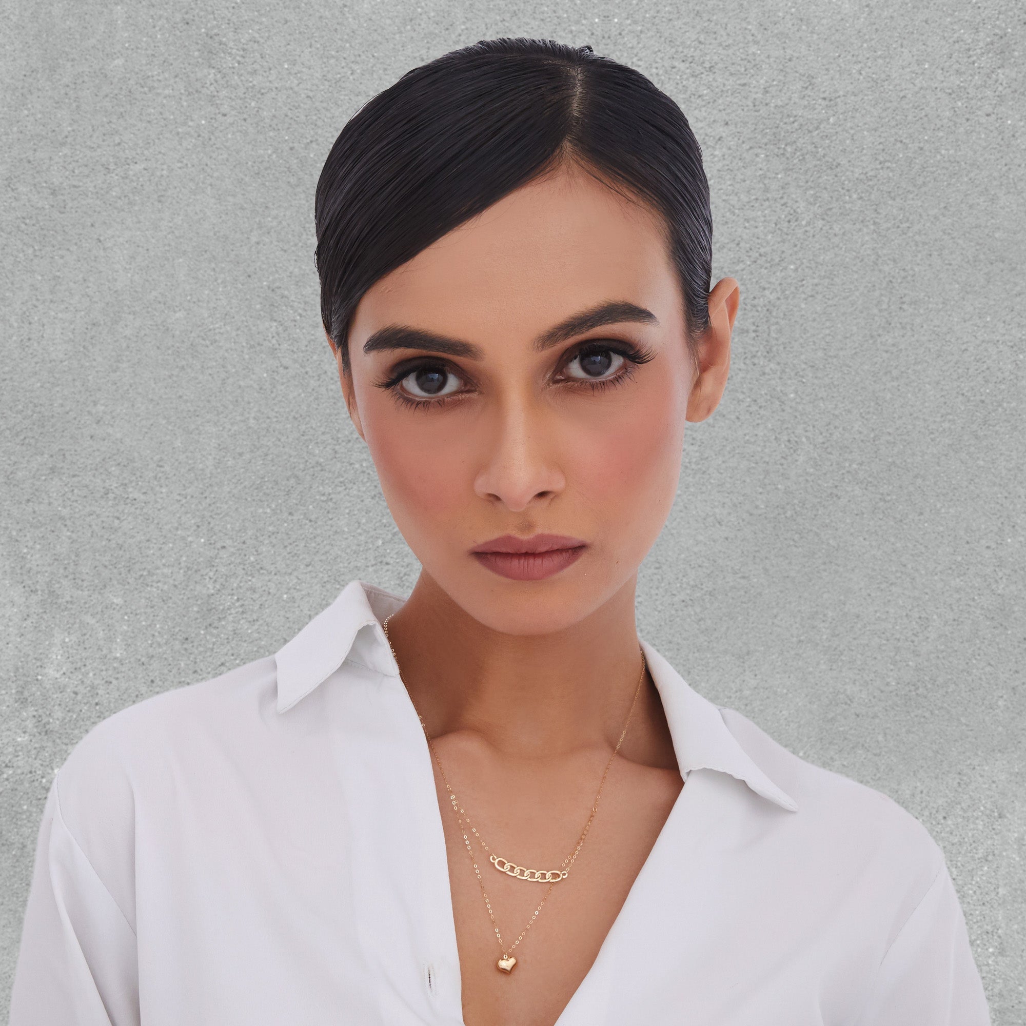 A chic layered gold necklace featuring a bold link bar and a dainty heart charm, perfect for adding everyday shine and feminine flair.