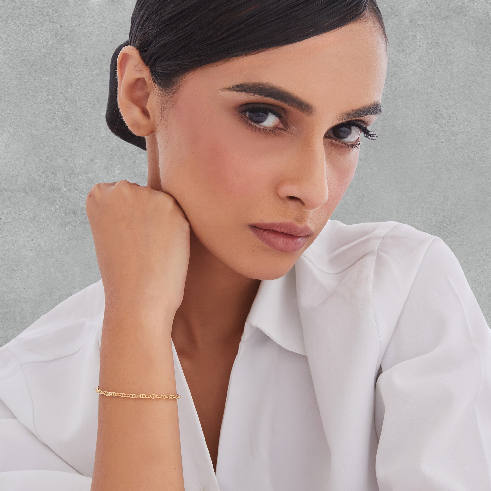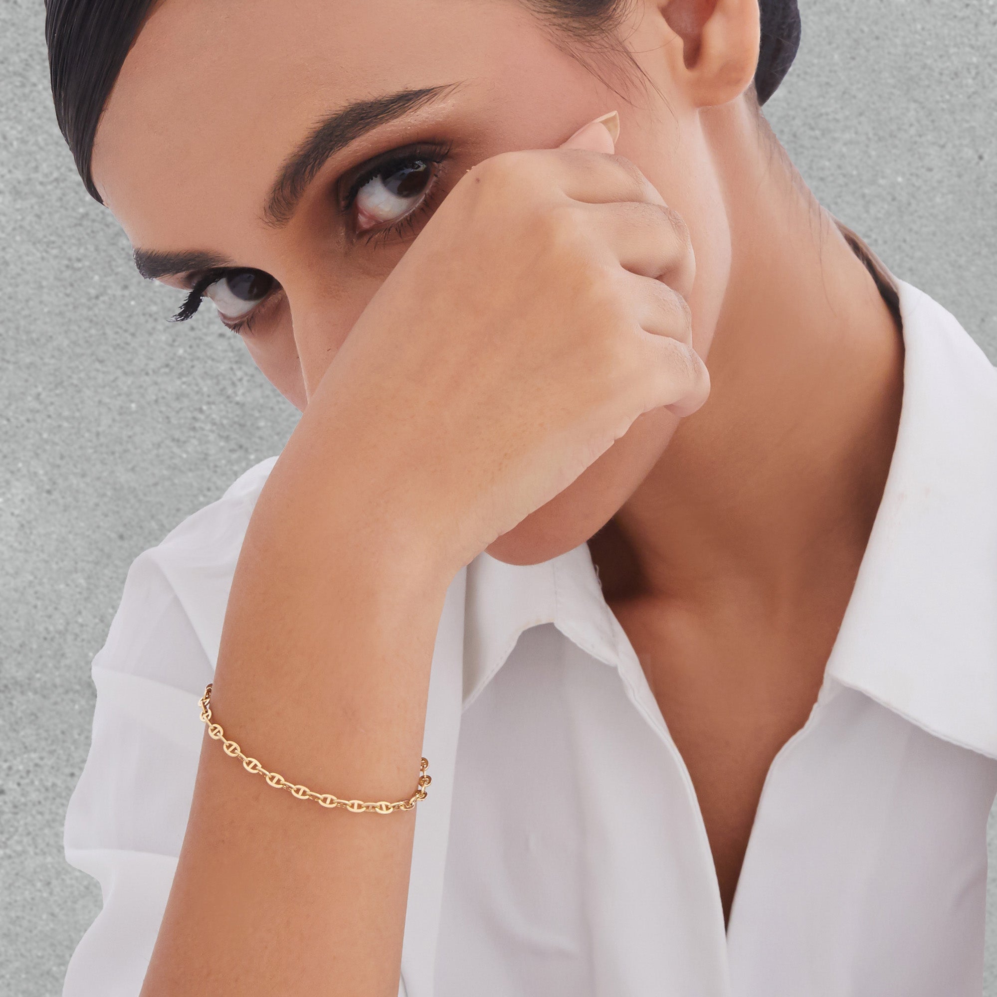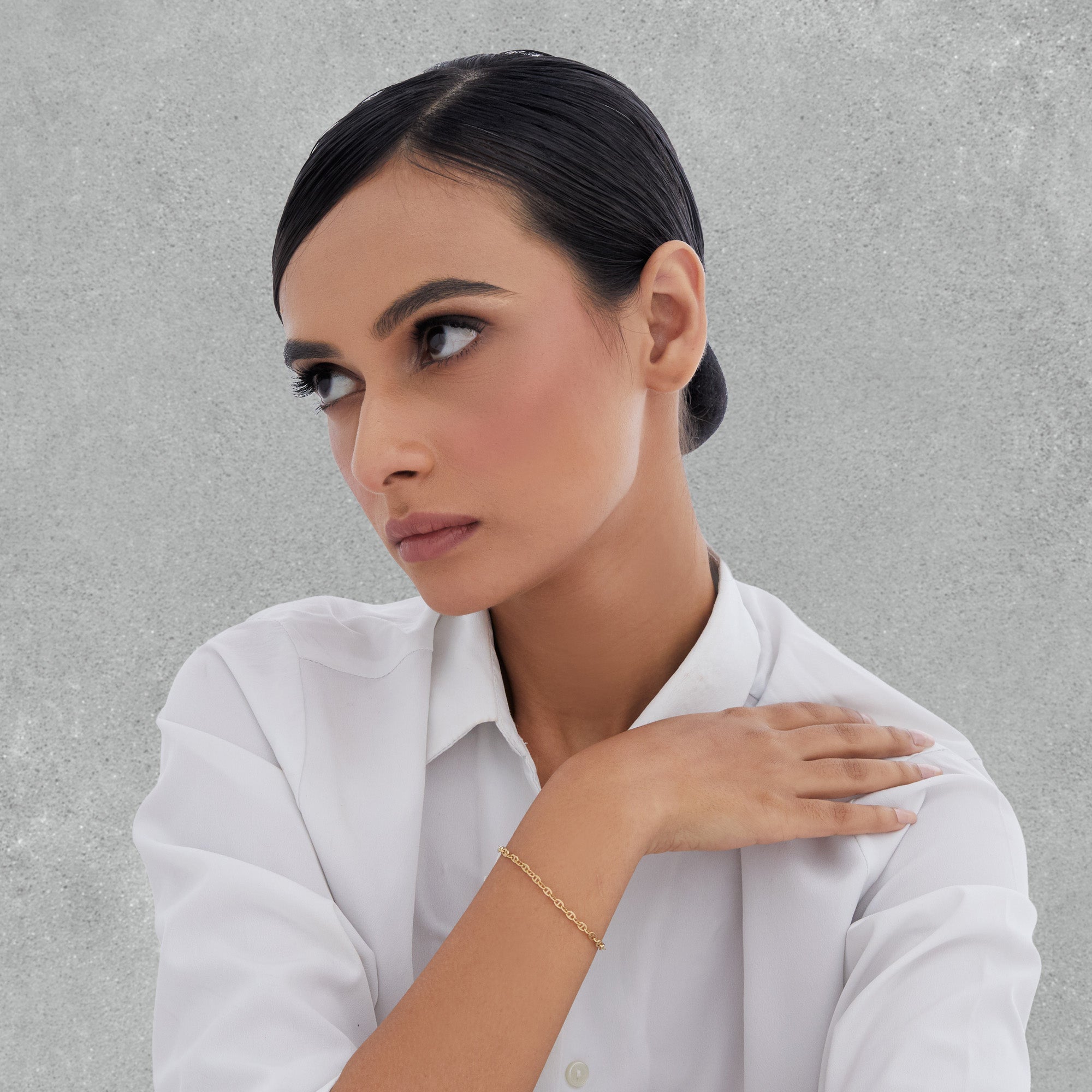 A sleek 18k gold chain bracelet with polished links — a minimalist everyday piece for women who love modern, lightweight gold jewellery and timeless elegance.