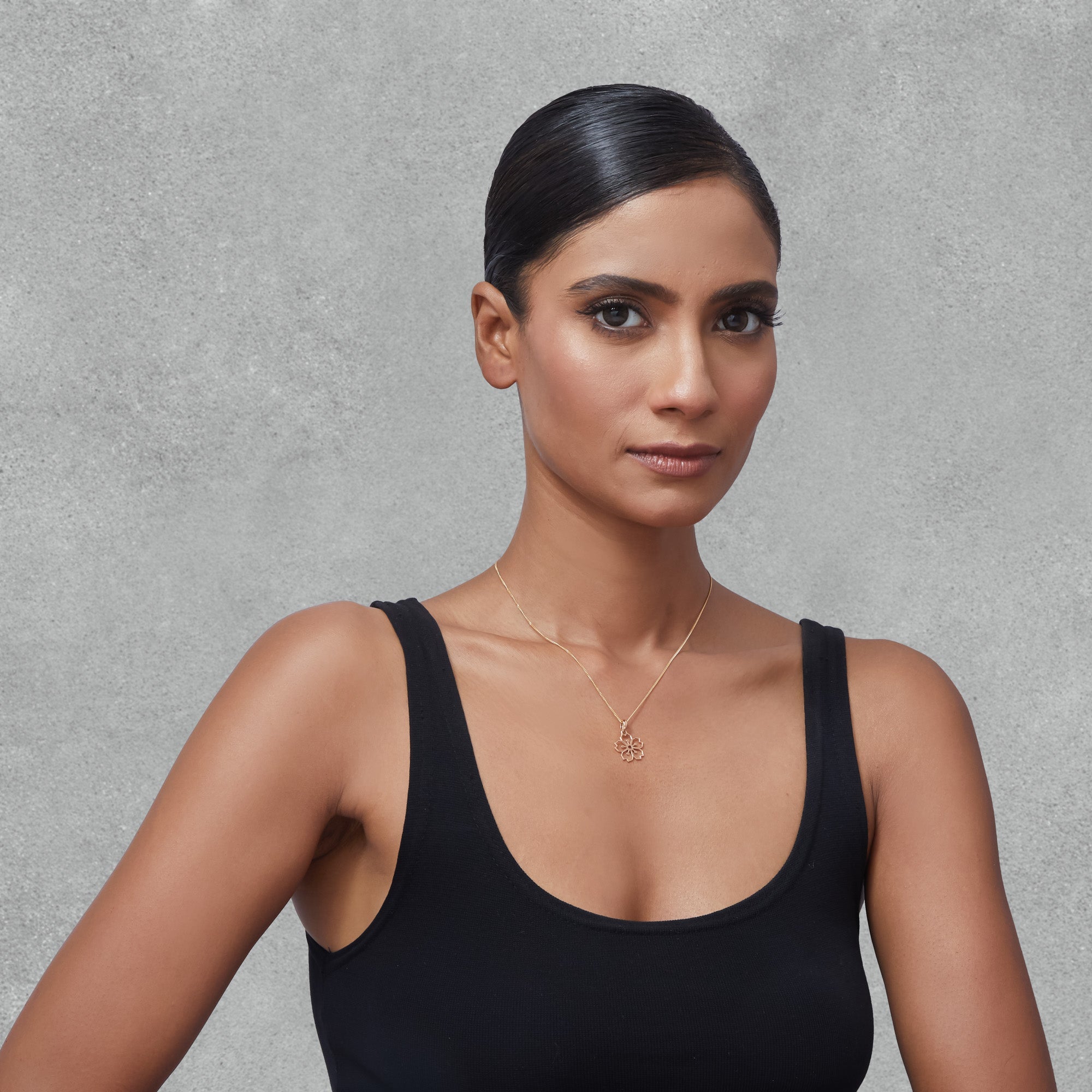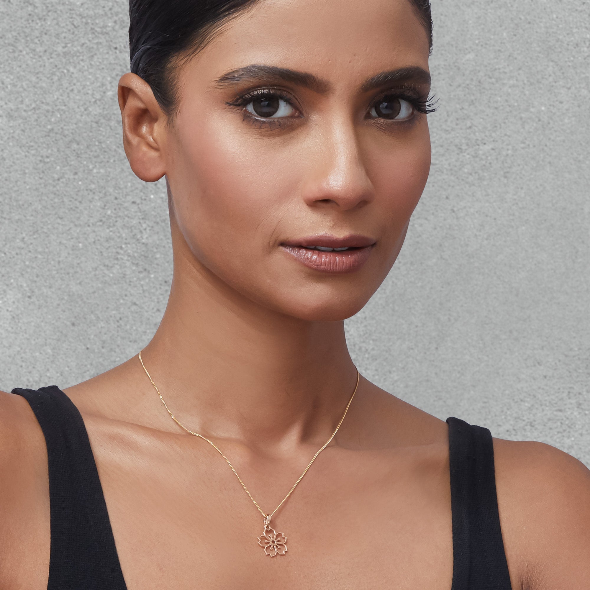 Delicately crafted in 18k gold, this openwork floral pendant features fine petal detailing and a polished finish. Light and refined, it brings a graceful touch of nature-inspired elegance to any look.