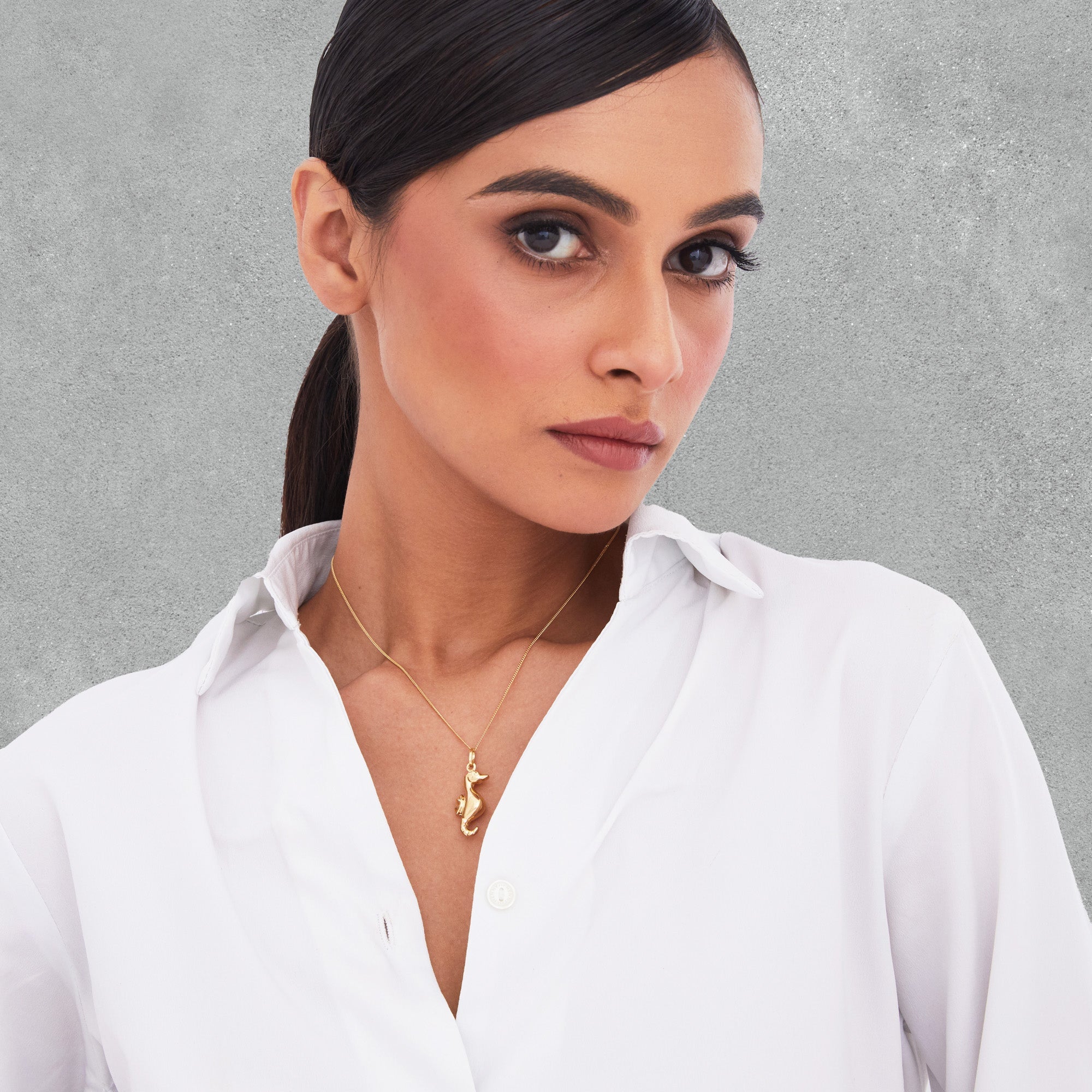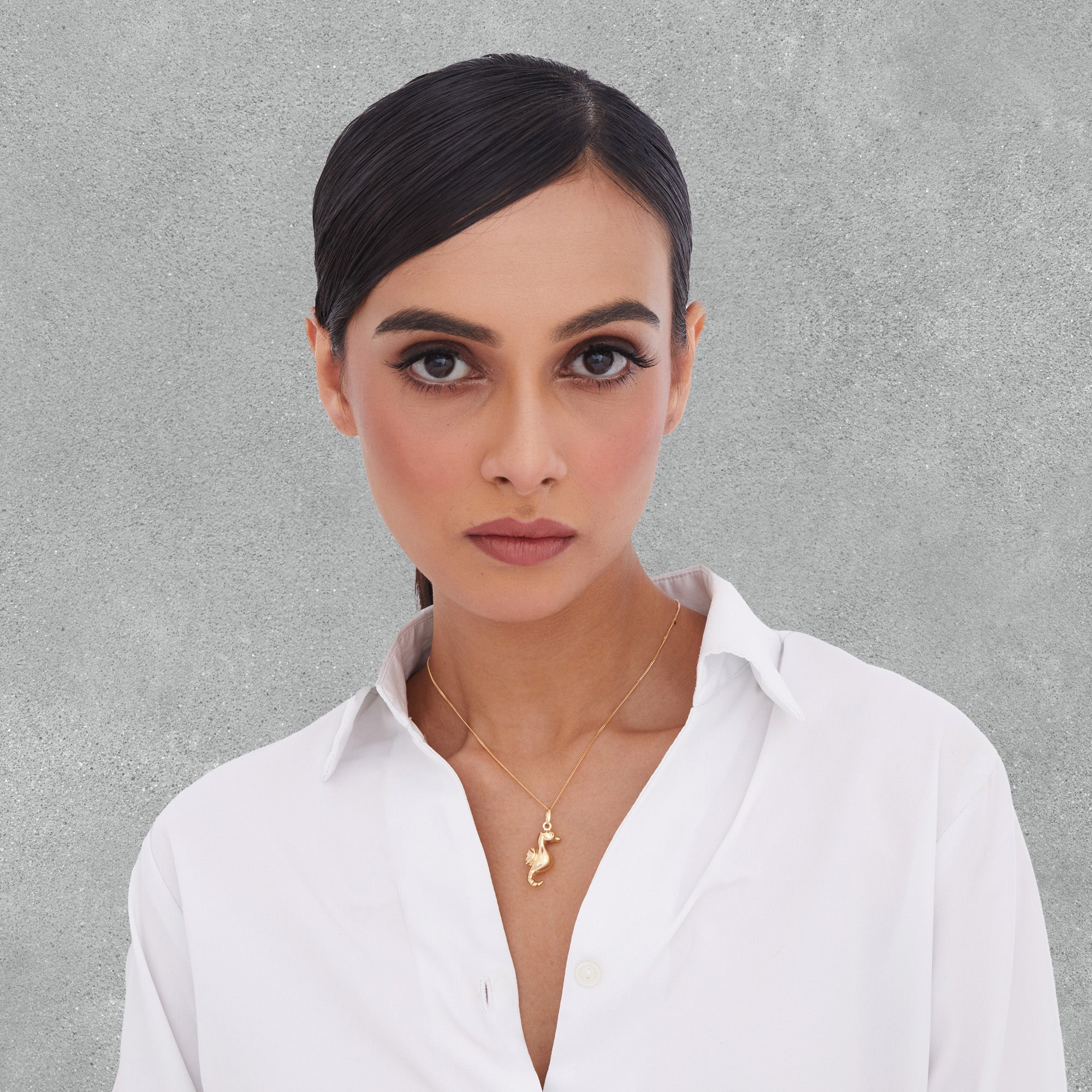 A graceful 18k gold seahorse pendant symbolising intuition and calm strength — made for women who move through life with quiet depth and effortless charm.